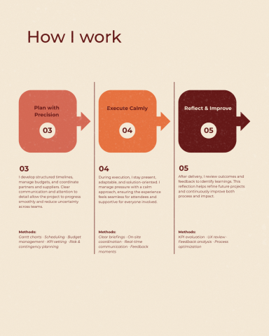 Een evenement is de sleutel tot het succes van een bedrijf, omdat het de unieke mogelijkheid biedt om je merk te versterken en diepere verbindingen met klanten te creëren. Het is ook een prachtige kans om onvergetelijke ervaringen te delen die de kernwaarden van je onderneming uitdragen. Wat mij uitzonderlijk maakt, is mijn vermogen om praktische kennis van evenementenuitvoering te verbinden met emotionele intelligentie en strategisch inzicht. Met een solide basis in evenementenproductie, marketingcommunicatie, gastvrijheid en duurzaamheid navigeer ik moeiteloos tussen visie en realisatie. Ik leid met helderheid, zorg en verantwoordelijkheid, en zorg ervoor dat elk evenement niet alleen een succes is, maar ook een blijvende impact heeft op iedereen die erbij betrokken is. Door deze inspirerende aanpak maak ik een wezenlijk verschil, zodat elk evenement niet slechts een moment is, maar een onvergetelijke ervaring die de bedrijfsdoelen versterkt en je team motiveert om groots te dromen en te presteren!